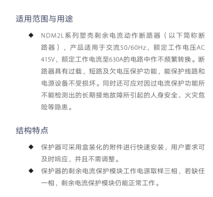 NDM2L 塑壳剩余电流动作断路器,产品适用于交流50/60HZ,额定工作电压至690VAC,额定工作电流至800A的电路中做不频繁转换及电动机不频繁启动之用。断路器具有过载、短路和欠电压保护功能,能保护线路和电源设备不受损坏。